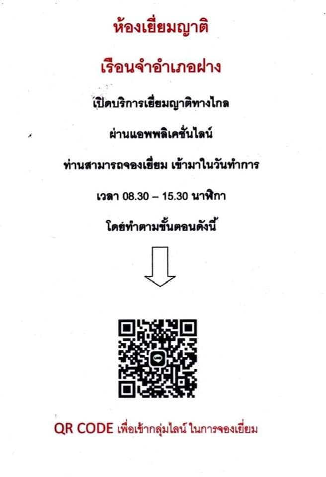 ห้องเยี่ยมญาติ เรือนจำอำเภอฝาง เปิดให้บริการเยี่ยมญาติหน้าเรือนจำและจองเยี่ยมยอดออนไลน์ สามารถ สแกน Line 1 และ Line 2 เพื่อติดต่อสอบถามการจองเยี่ยมญาติ